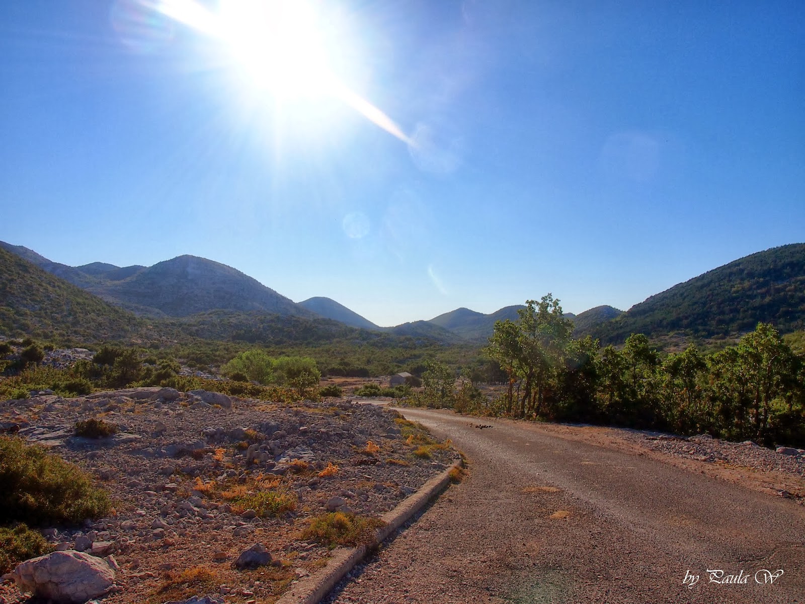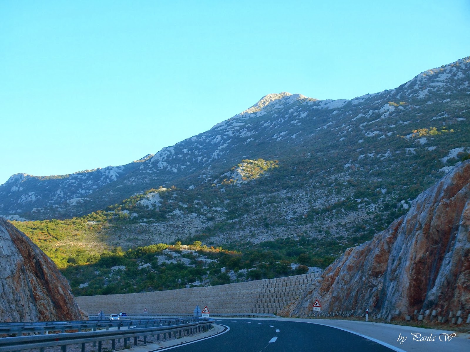 Wjeżdżamy do Chorwacji,a tam jedyne plus 4 stopnie!!! Szok i wyraz twarzy pytający: o co chodzi i gdzie my jesteśmy? Jedziemy dalej. Słonecznie,ale nadal zimno. Mijamy sporo tuneli w górach, co wygląda naprawdę niesamowicie, szczególnie te długości kilku kilometrów. Na szczęście po wyjechaniu z jednego z nich temp. wzrosła do 12 stopni, a po wyjechaniu z tego o dł. 7km aż do 22 stopni i tu zaczęły się również widoki zapierające dech!!!